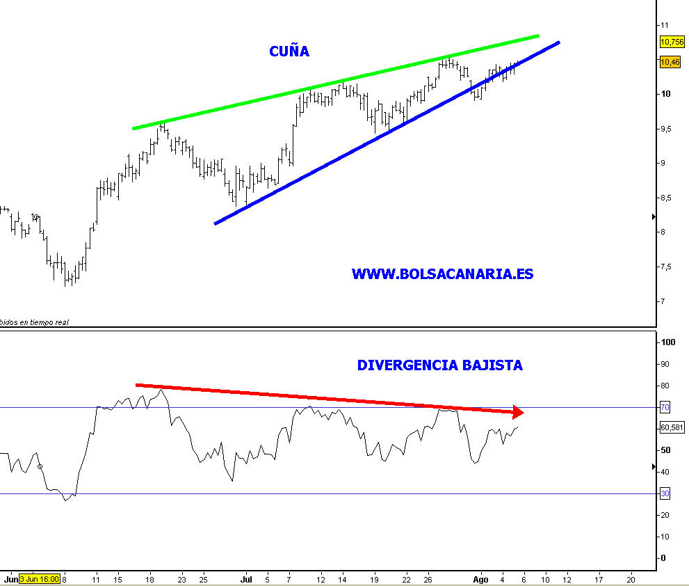 Que algo suba en cuña y en divergencia bajista no es señal clara o directa de cerrar la posición y mucho menos ponerse corto en nada, simplemente es un AVISO de que cuando la cuña si viole por la parte que une mínimos hay que salirse y cerrar y ya cortos para quienes tengan un perfil más profesional o agresivo.