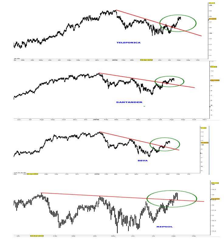 No obstante hay que ser prácticos y más en Agosto, nosotros lo tenemos muy claro, si ROMPE LA DIRECTRIZ ALCISTA que trae desde el 1 de Julio, nosotros salimos de renta variable o incluso trataremos de aprovechar potencial corrección con posiciones cortas.