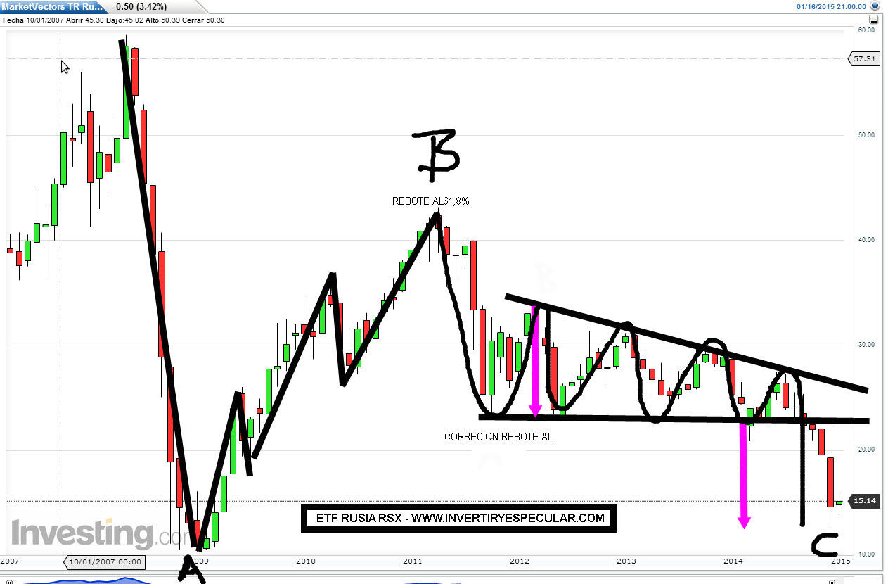 Ahora más en serio porque me leo y me desmoño yo solo, para servidor el índice Ruso visto desde el RSX ha culminado una pauta ABC aunque la C por motivos puntuales pueda ser violada otra vez por nuevos ataques de volatilidad, pero vamos ya con el temporal padecido, menores precios son más compras del producto nunca ventas.