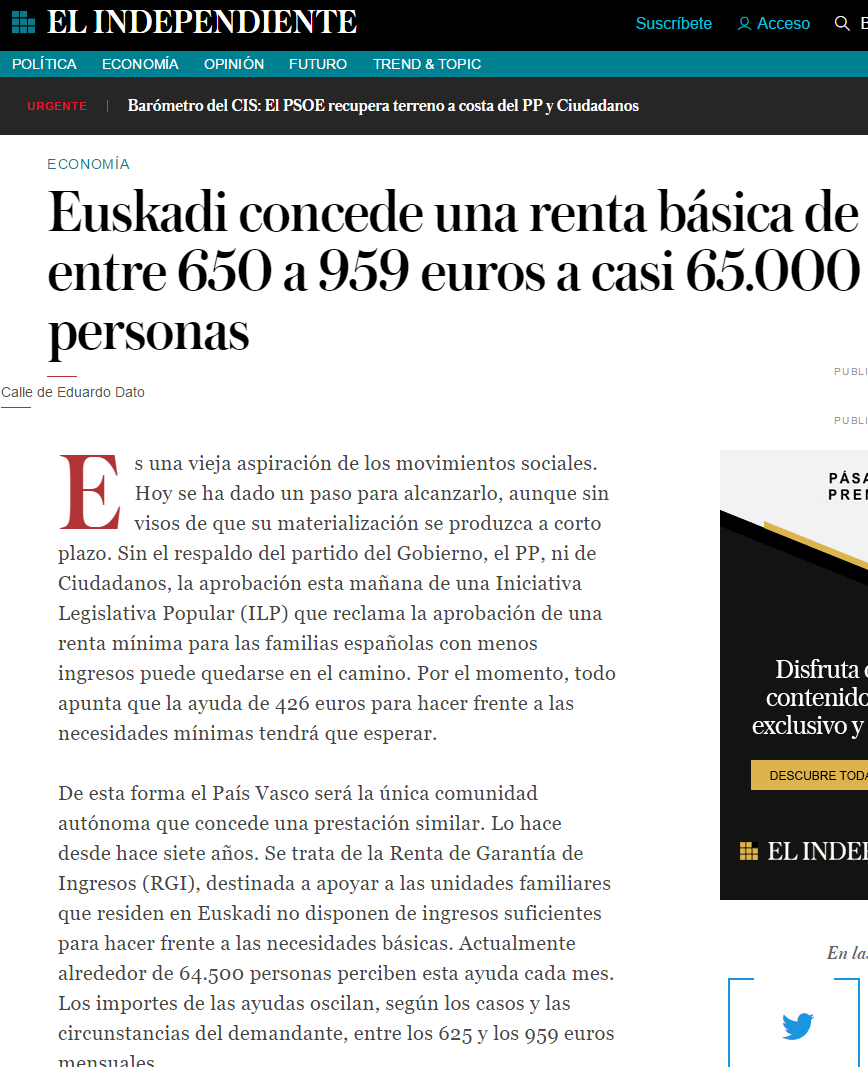 ¿Ahh, pero ustedes no saben tampoco de que les hablo? en el país vasco existe una cosa llamada RGI que es otorgada como un «derecho subjetivo” –si cumples los requisitos, la Administración pública vasca te abonará la prestación sin problemas– siendo la mayor parte de los perceptores mujeres con hijos a cargo y pensionistas; los importes de las ayudas oscilan entre los 625 y los 959 euros mensuales. Y además de la citada ayuda también se concede una Prestación Complementaria de Vivienda que es una ayuda para el pago de alquiler, que supone en la práctica una percepción extra de otros 250 euros mensuales, además de existir otros tipos de ayudas que han dado pie a que yo haya hablado del tema en otras ocasiones –era un caso además de otra CCAA pero les ruego lean los comentarios– y lo siento pero es la realidad, señoras y señores, les guste o no.
