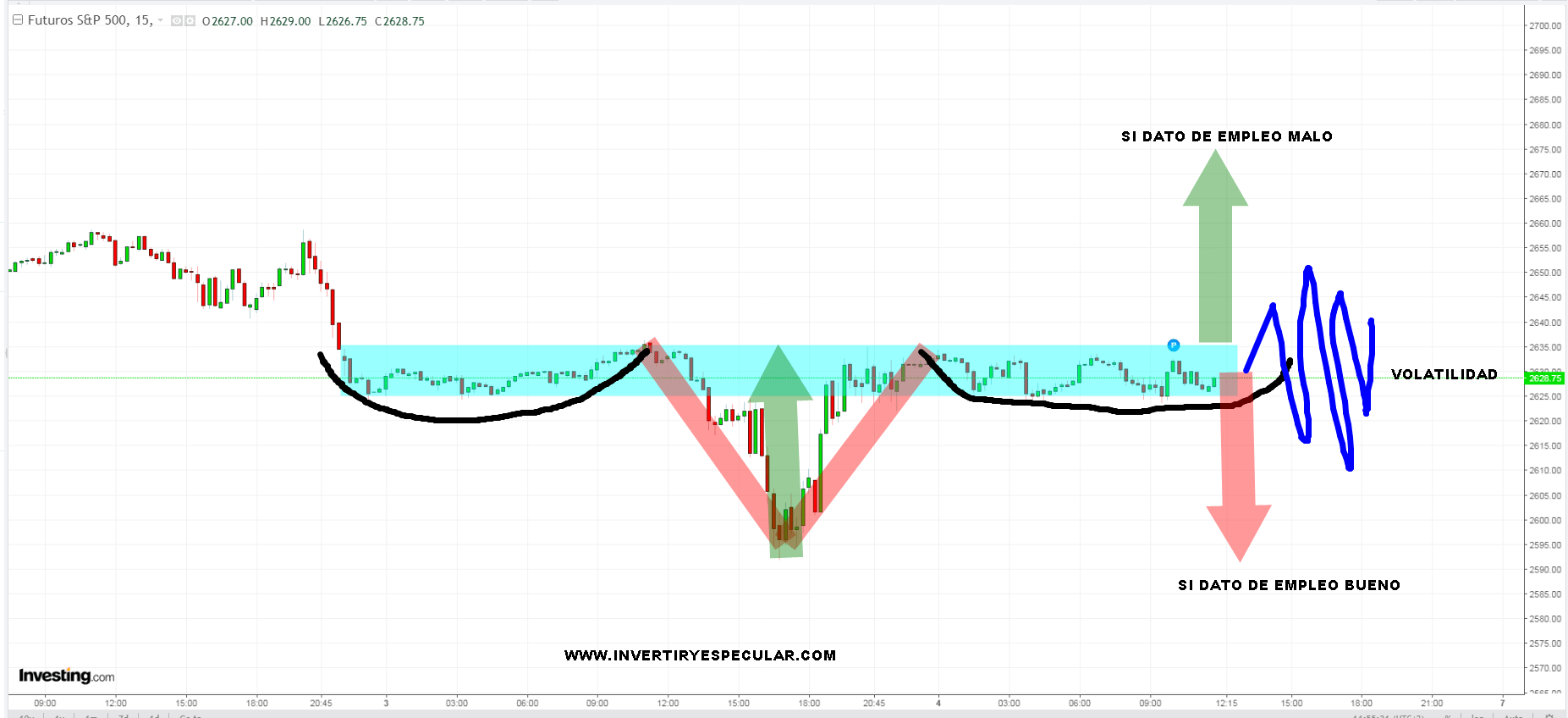 Fijaos en el futuro del SP500 como se está comportando en el horario nocturno en EEUU tras la vuelta alcista en V de ayer. la figura que está dejando el precio tras de si parece la de una cabeza hombros invertidos que podría tener destino 2675 si el dato de empleo sale peor de lo esperado, pero si sale mejor de lo esperado no podríamos descartar otro ataque a mínimos y cerrar la semana muy cerca de soporte.