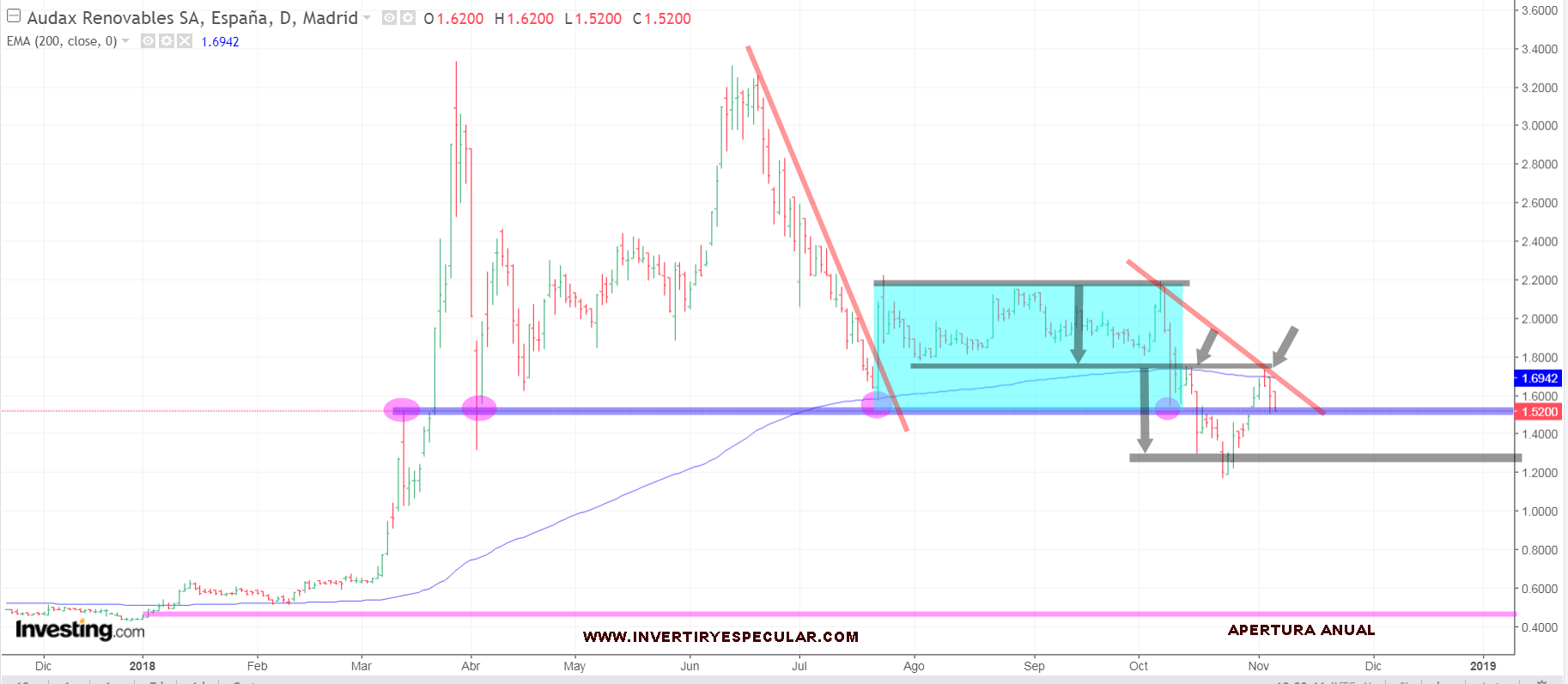 Audax cayò en octubre un 10% menos que Solaria pero claro poco consuelo es caer un 46% en un mes, lo malo es que perdió soporte de rango trató de volver a él pero la el mismo y la EMA 200 se lo impidieron, tras tocar los 1.20 euros rebote para repetir la operación y volver a recuperar al menos su línea polar cosa que por el momento consigue pero la EMA 200 la vuelve a frenar ejerciendo de resistencia. Mantener y esperar a que recupere media y soporte de 1.7 euros para pensar en entrar. Lo mismo que Solaria a pesar del tremendo batacazo y deterioro a corto plazo si en verde este año.