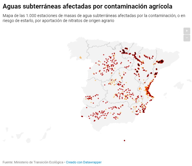España no ha vigilado bien la contaminación que los residuos agrícolas y ganaderos filtran a los acuíferos hasta el punto de que la Comisión Europea abrió un expediente sancionador por ésto en noviembre pasado. La consecuencia es que hasta el 46% de las masas de agua subterránea padecen contaminación por nitratos provocados por la utilización de fertilizantes y el estiércol de las granjas ganaderas, según el listado recién elaborado por el Ministerio de Transición Ecológica.