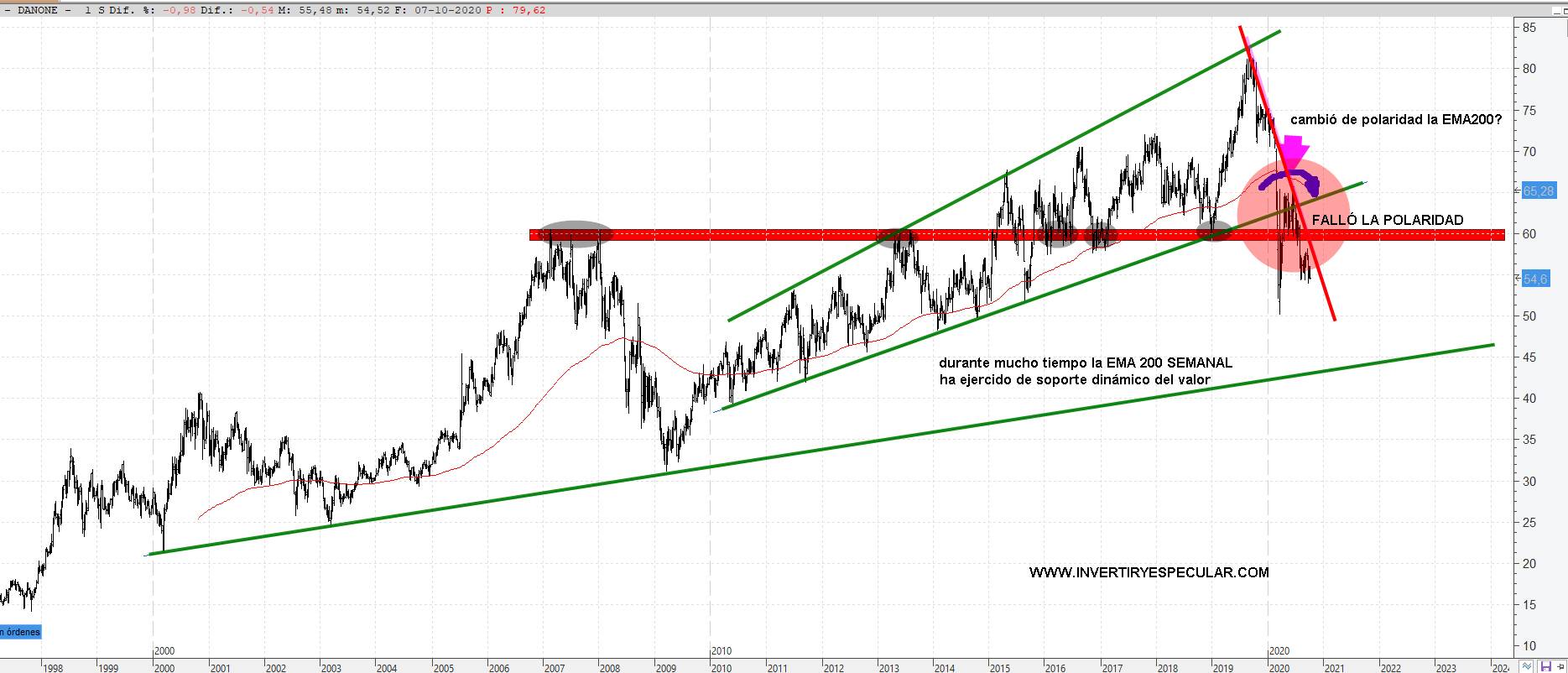 Fundamentalmente no sabemos pero técnicamente perder la EMA 200 semanal que venía ejerciendo de fiel soporte y de orden de recogida de papel, luego pierde la directriz propiamente dicha que unía mínimos de todos estos años, encima pierde los 60 y al rebote se encuentra que la directriz y la EMA 200 le dan la patada abajo cotizando ahora por debajo de los 60 euros máximos de la serie precedentes al último techo.