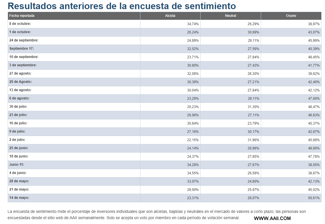 La lectura de ayer al cierre se quedó en absolutamente neutral pero la de esta semana en la AAII no, ahora los alcistas pasan a ser 1 de cada 3, al llegar al tercio del sentimiento del mercado como que se conforma no suben más pero el mercado no baja.