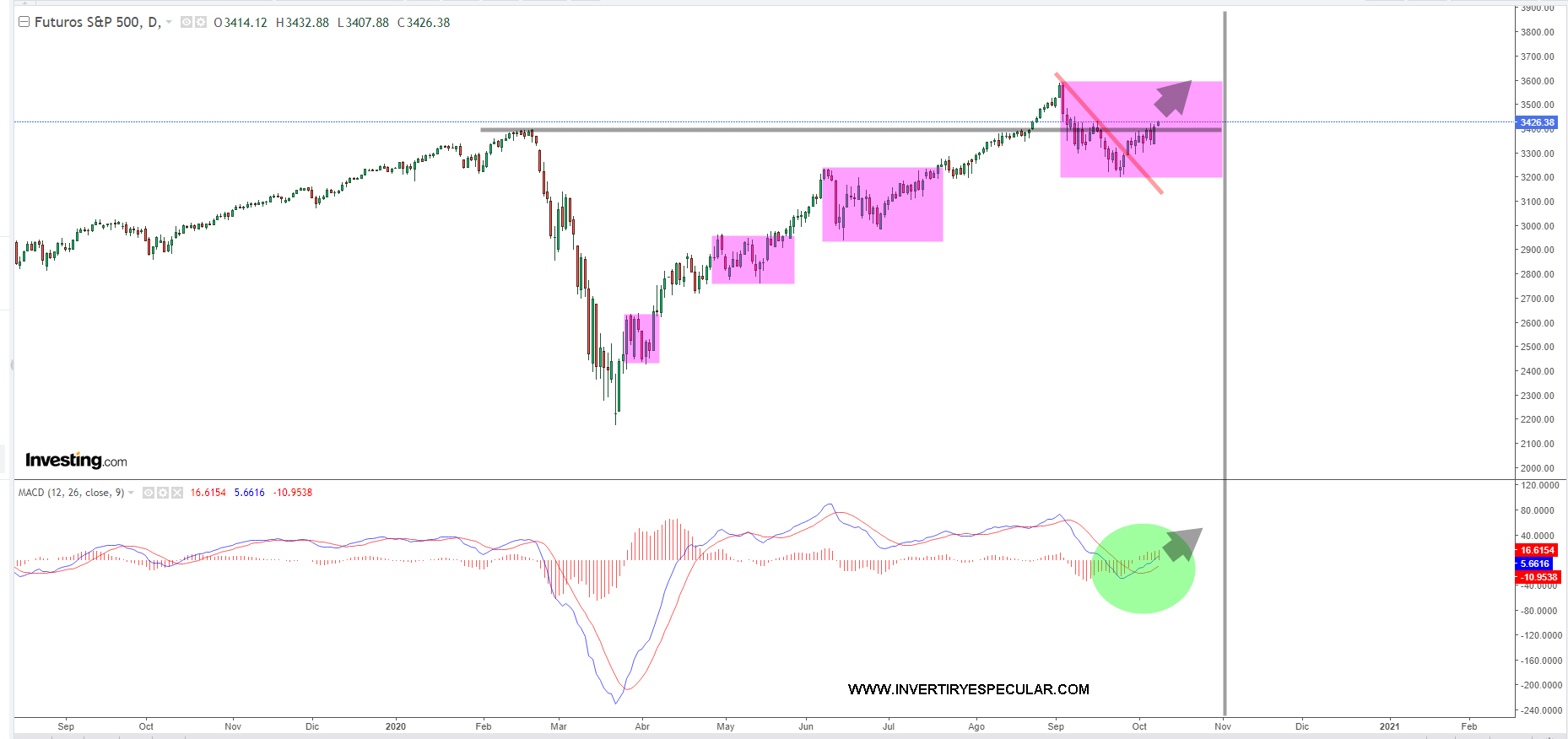 Parece que deja claro que no va a esperar en mínimos al nuevo Presidente electo, tras la última corrección cuando a primeros de septiembre hizo nuevo techo histórico el precio se ha recuperado y vuelve a superar máximos de febrero, la directriz bajista queda bien atrás ya hace diez sesiones consecutivas, el MACD se corta a alza autorizando un ataque al alza para antes del supermartes electoral.