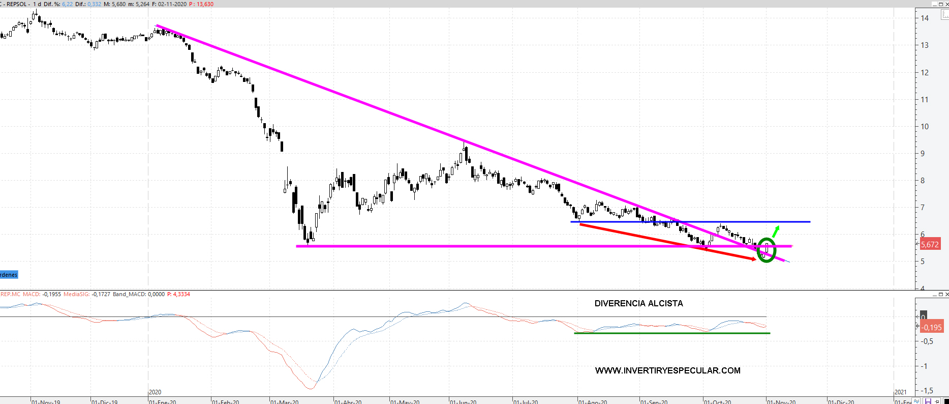 Hoy el valor estrella del Ibex y recordamos que en nuestro último comentario atisbábamos un rebote a zona 6.5 euros con más miedo que vergüenza dado los precios del crudo y las elecciones de EEUU, la veíamos recuperar mínimos de marzo y romper la bajista de febrero y que menos que ir a por los 6.5 euros.