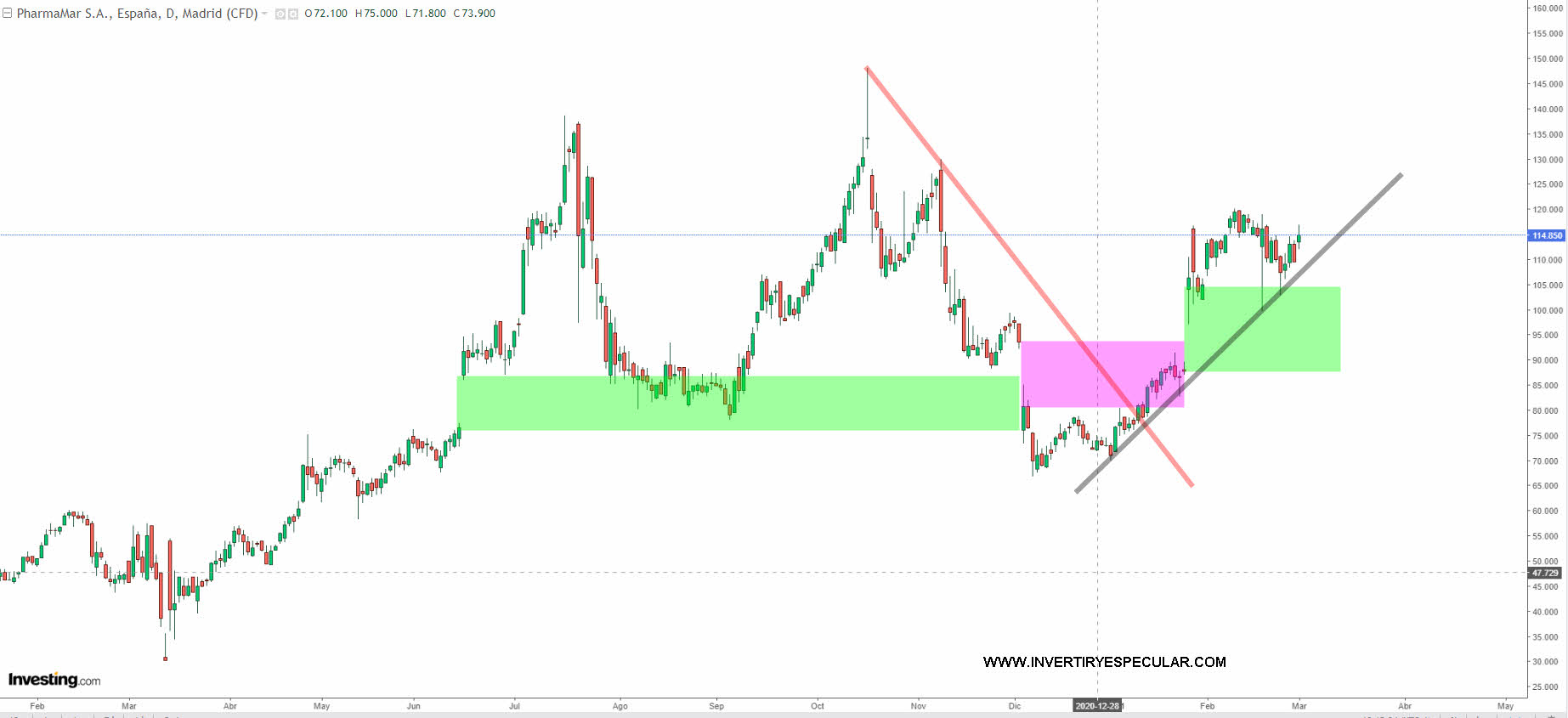 Para nosotros a estos precios desde luego está bien valorada la acción y solo si se introduce el APLIDIN en la red sanitaria global cambiaríamos de opinión lateral a alcista. En Pharmamar somos «todos» muy proclives a confundir futuro con presente, ahora mismo el presente es bueno y ya lo sabe el gráfico así está como está, el futuro puede ser mejor pero el gráfico ya tiene parte descontado del mismo.