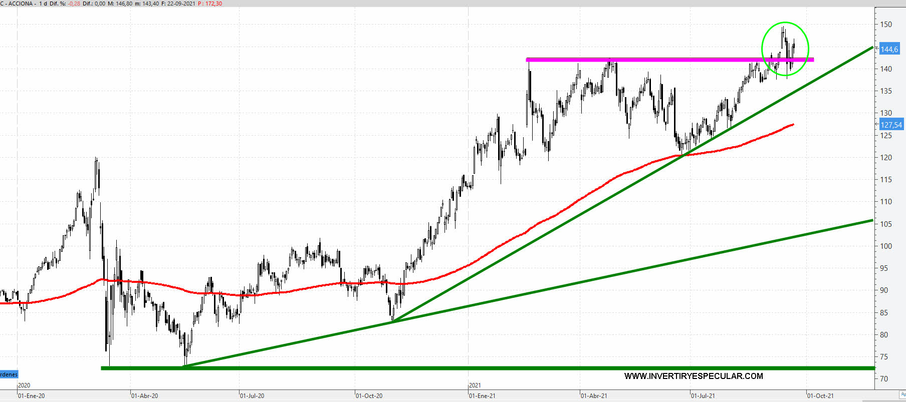 A partir de 150 euros entraría en subida libre en gráfico ajustado con dividendos. Sus rentabilidades son muy llamativas porque está mucho mejor que mercado, Acciona este año renta un 23%, en un año completo un 53% y en los tres últimos años un 92%. Lo tiene todo, pero claro lo bueno bonito y barato es muy difícil de conseguir tanto en el mercado físico como en el financiero. Nadie regala nada y menos en bolsa.