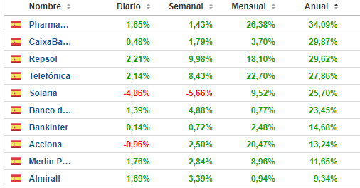 Este es el TOP TEN a fecha de hoy en el 2022 IBEX 35, en el último mes solo supera a estas tres Pharmamar: